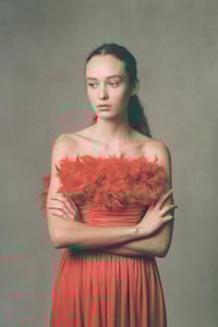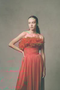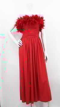 • Midi-dress • Red crepe • Full skirt • Ruched top • Feathers around bust and rear • Cinched waist • Made in England